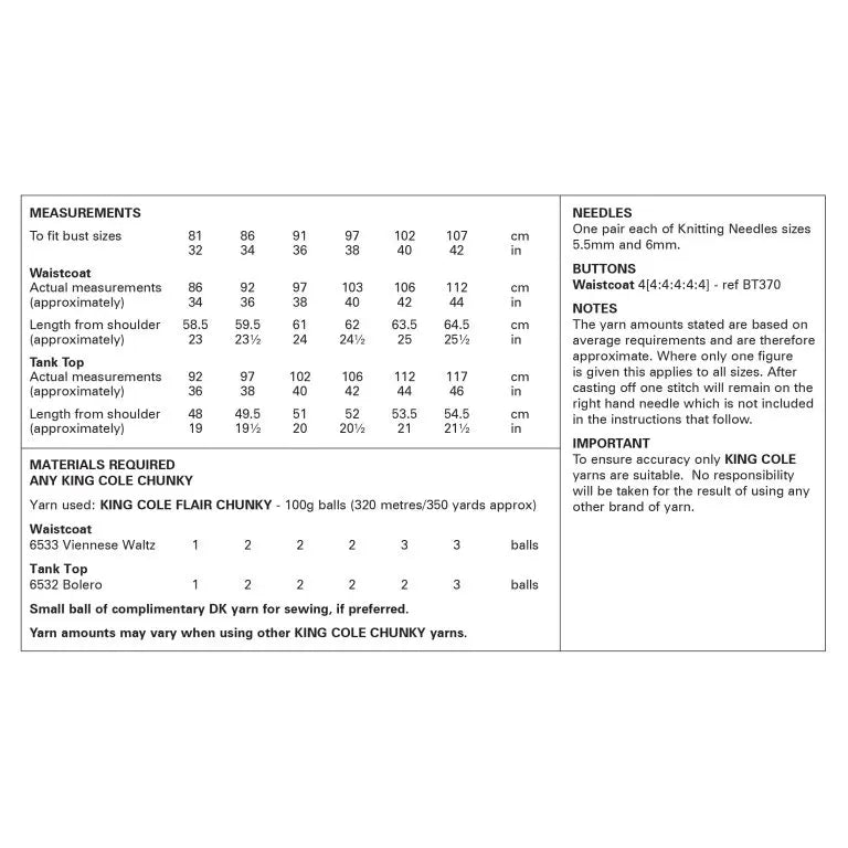 King Cole 6382 Waistcoat and Tank Top in Flair Chunky (leaflet) Knitting Pattern