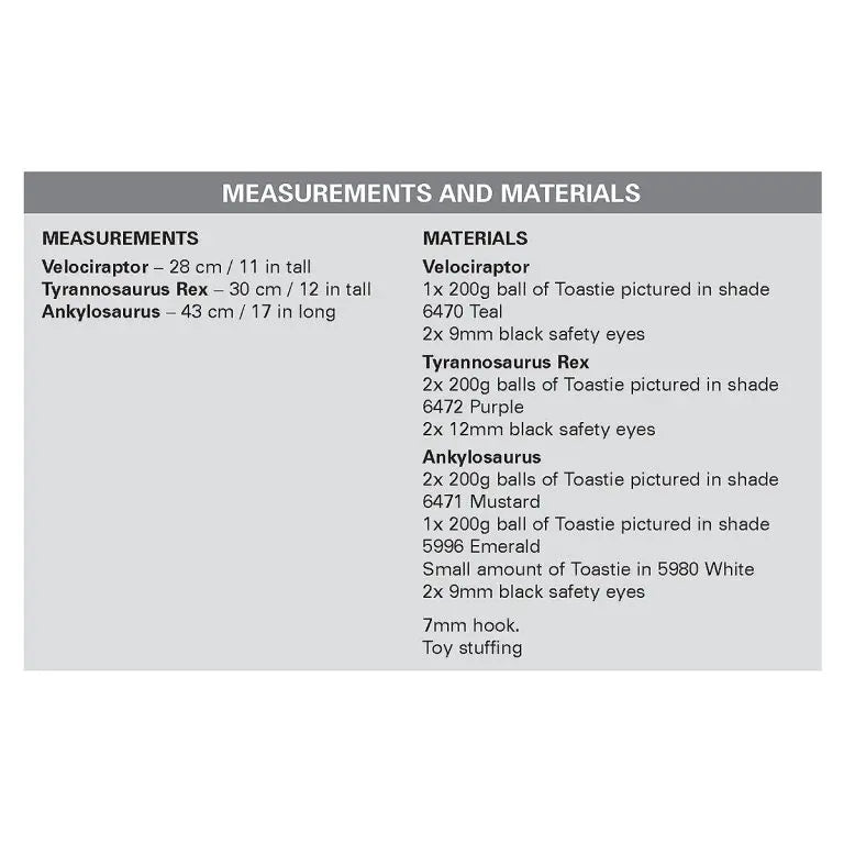 Transform your crafting into a prehistoric adventure with King Cole Toastie Dinosaurs Crochet Pattern 9222! This pattern includes instructions to make a Tyrannosaurus, Velociraptor, and Ankylosaurus, perfect for any dinosaur enthusiast. Crochet your very own cuddly and playful dinos with ease.